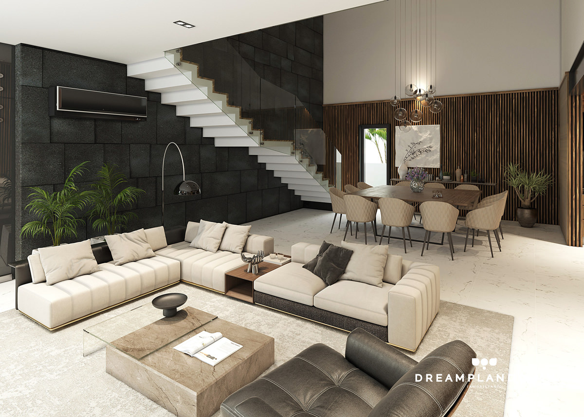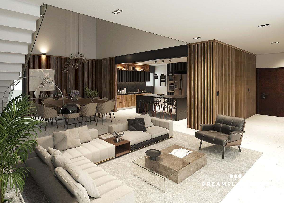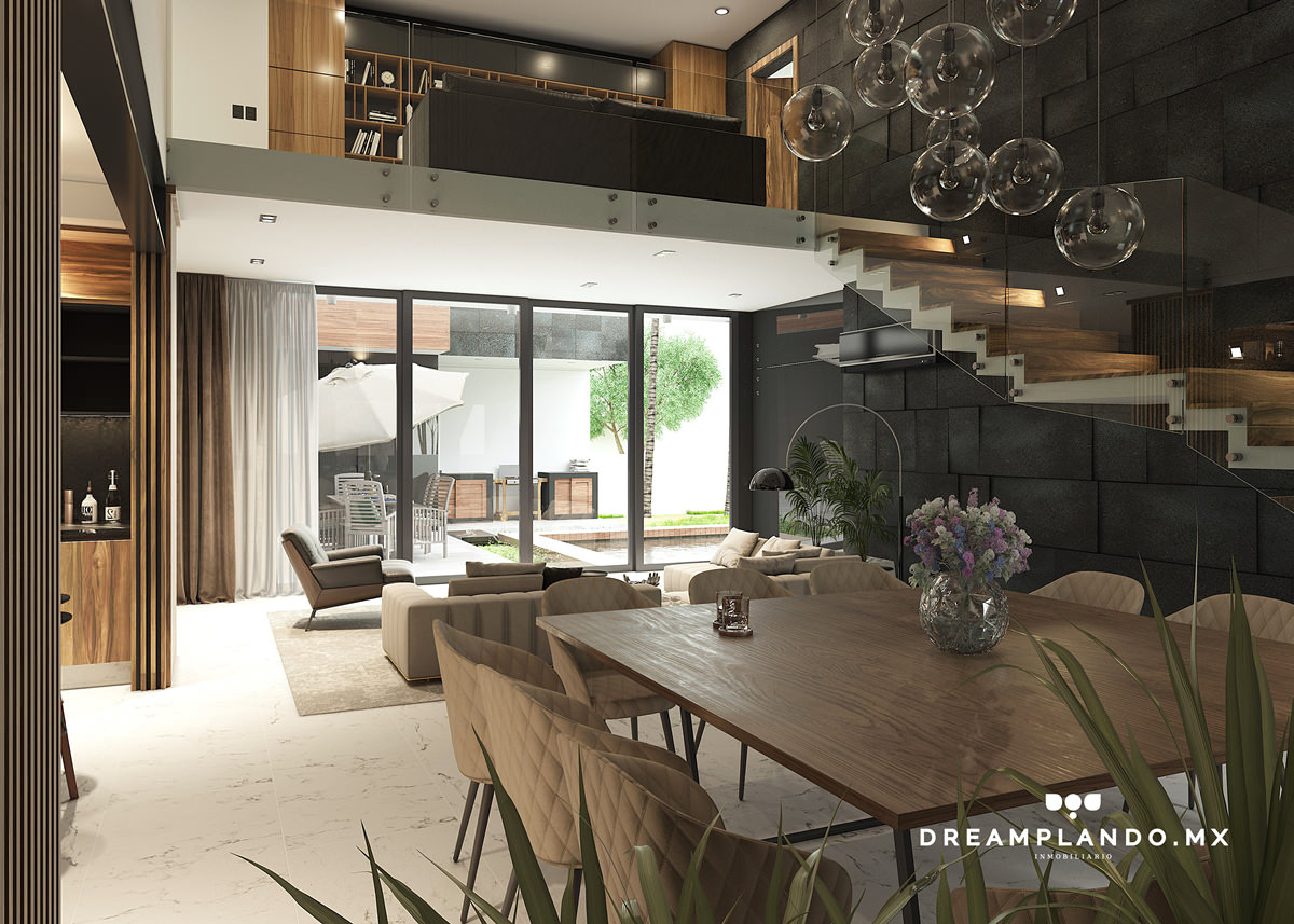 Aquí, la arquitectura se abre hacia el exterior, la doble altura da profundidad a los espacios y el área social se convierte en el corazón de la casa.