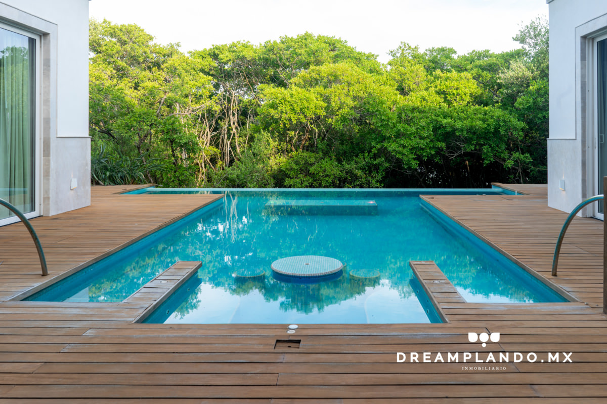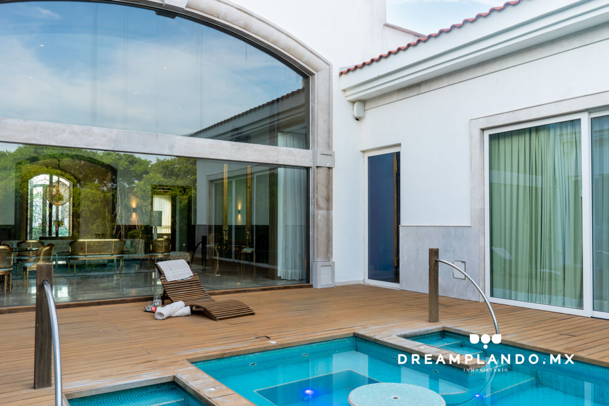 El área exterior de la casa, con una alberca de 51.775 m² y un asoleadero con duela de madera importada de Brasil, es ideal para el entretenimiento y la relajación. Cada elemento, desde la madera tratada anti-plagas hasta el sistema de riego automatizado, ha sido cuidadosamente seleccionado para ofrecer durabilidad y estética.