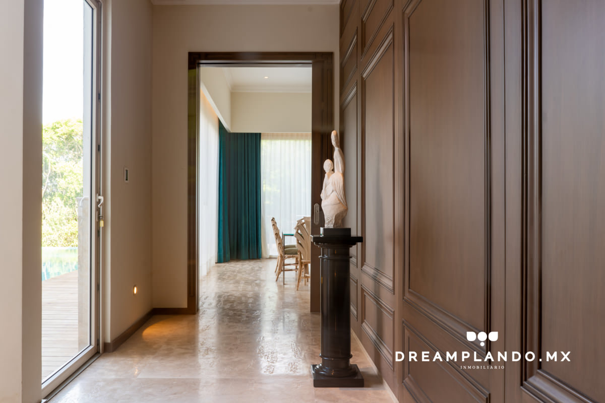 El estacionamiento para tres autos y la cochera automatizada ofrecen conveniencia, mientras que el vestíbulo, con su mármol abrillantado y acabados de primera calidad, da la bienvenida a un hogar que se distingue por su atención al detalle.